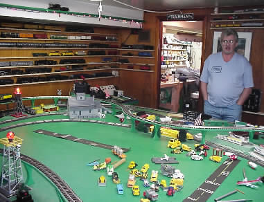 Rich Raighn - has a point-to-point 'layout' running near the ceiling that circles the layout room. Rich's rectangular layout is still in the planning stage - but his young son seems to have the road construction detail all finished.