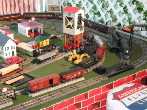 Hank Worrell - The East side of the layout features Hank's coal, oil and lumber industries as represented by the Flyer Oil Drum loader, Lumber unloading car and Seaboard coal loader. The new American Models K4 Streamliner backs down a siding to couple up with a passenger consist.