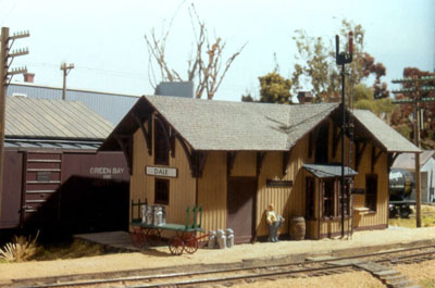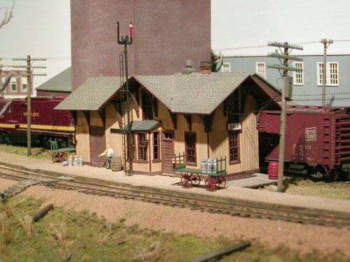 The Dale depot is scratchbuilt of styrene from plans and photos that appeared in The Soo magazine. Mike Polsgrove made the colored signs in his computer and printed them out on glossy paper.