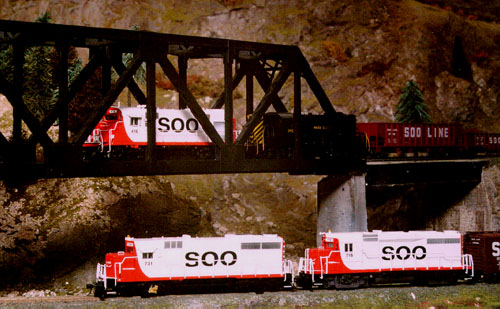 Below them are SD40 # 751 and GP30 #716 also heading west under the high bridge at Givva dam.