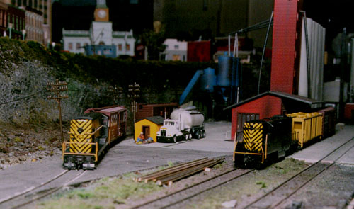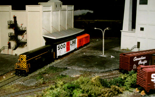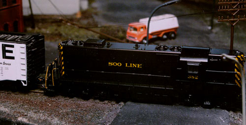 Down in Saint-Charles, Geep#382 is pushing a boxcar alongside of