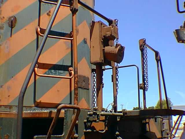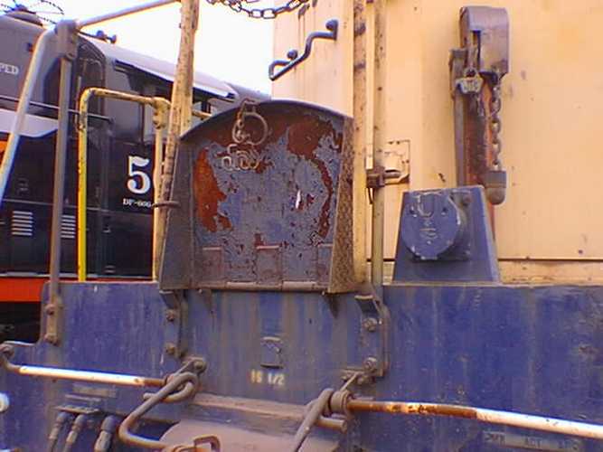 When the 5623 was built, it had a grand total of 13 air hoses on each end. Ten were for MU, two for the air brakes and a passenger signal line. The 5623 currently has 10 hoses as 1 MU hose was removed from each side and the HSC straight air hose was removed when the locomotive was converted to 24RL brakes. The first photo shows the 4 MU hoses remaining on the left side and to the right of them, a patch welded on the end sheet, covering the hole where the HSC line used to be.