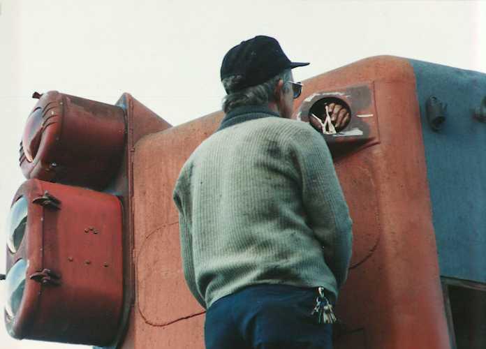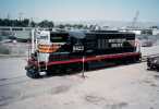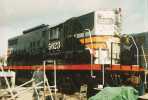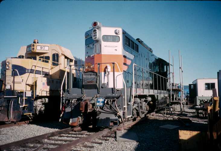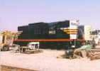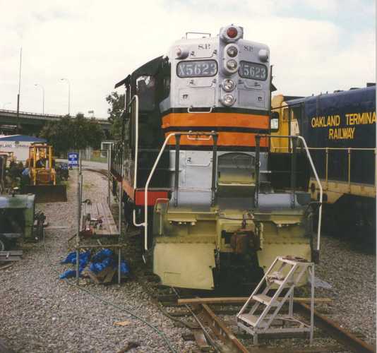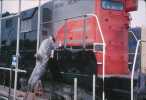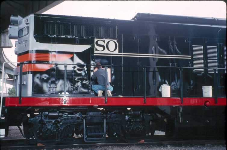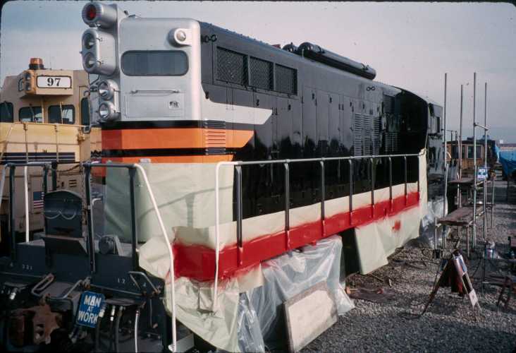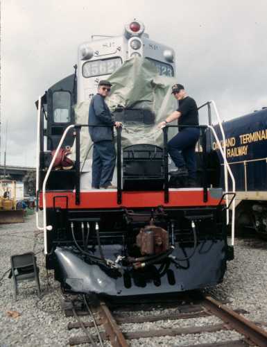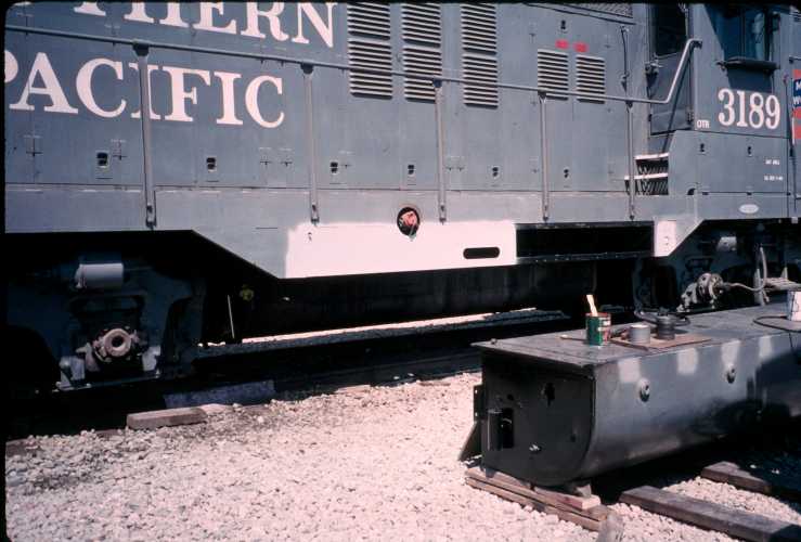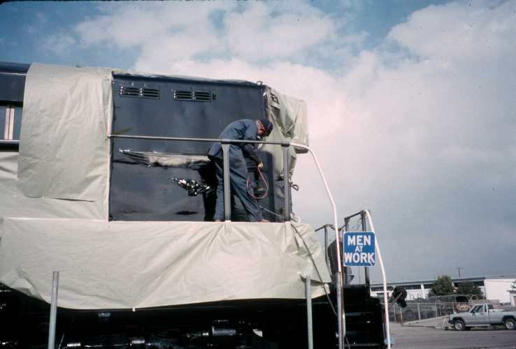 When we were finished, a friend who worked in Roseville got us a gallon of S.P. gray, but it did not match the rest of the locomotive. We knew there was some color difference between the 3189 and most other S.P. Geeps but this was way off. So, ultimately, the question of repainting it into Black Widow reared its ugly head. What the heck. Do it! Another friend presented us with copies of the original S.P. painting diagrams and color charts and so began 8 months of sanding, sanding, sanding (mostly Errol's job), and painting (mostly mine). Mixed with that were a couple of weeks of metal work on the nose and general dent banging. Little Bondo was used because she was is in remarkable condition after the 1986 Sacramento paint job. Fortunately for us, the winter of 1994 was a gentle one as all the work was done outside. The job was finally finished just 2 weeks before her departure for Sacramento and Railfair 1995.