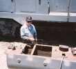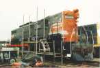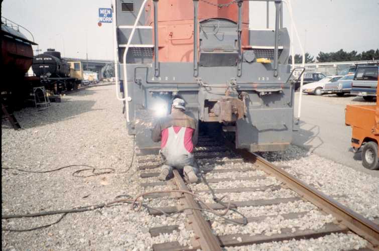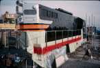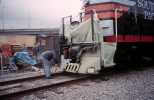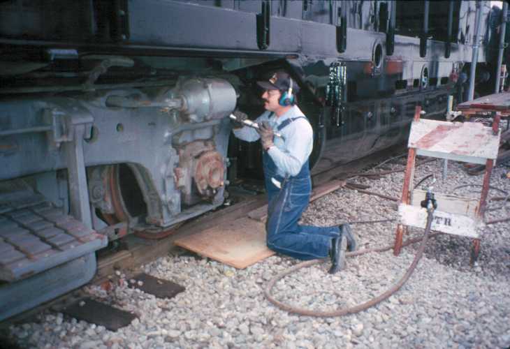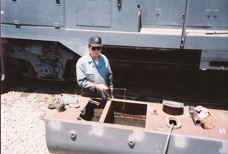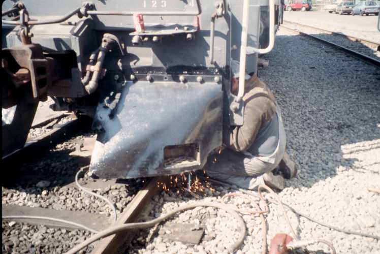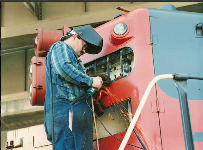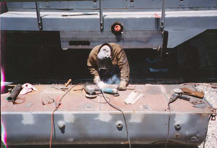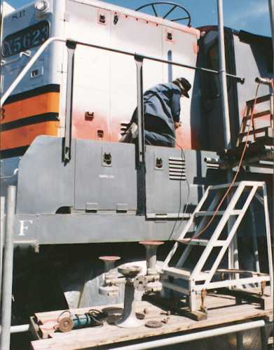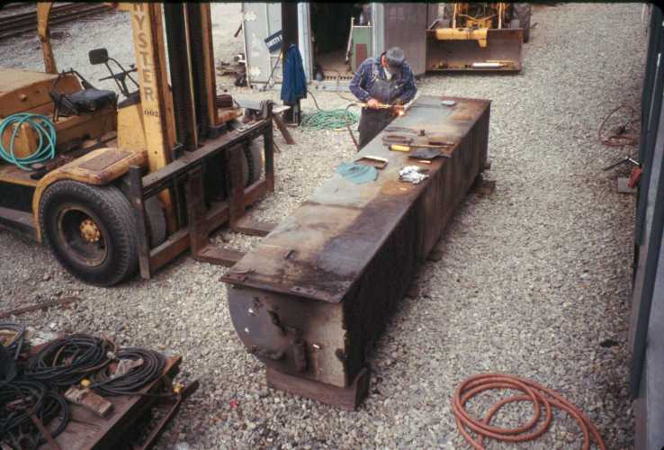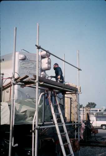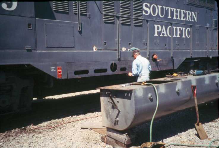 While the tanks were out, we decided to fabricate new skirting as it had been removed years before and added a lot to the cosmetics. A note regarding the skirting. In the sixties, there was a movement made to make the top of the fuel tank on Geeps more accessible for cleaning and less of a fire hazard. This was not a federal mandate but an individual railroad decision. The S.P. elected to follow this practice and thus the decorative skirting was torched away from all their Geeps. The fact that the skirting on the passenger Geeps did not hide the fuel tank but rather the water tanks did not alter the torch edict. And so, 30 years later, we were restoring this decorative accessory.