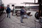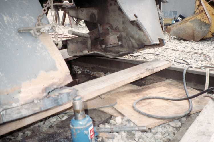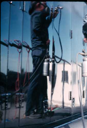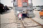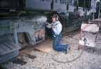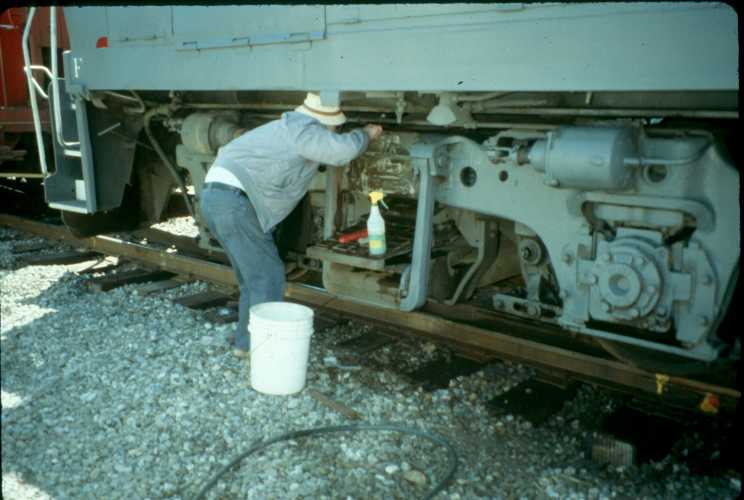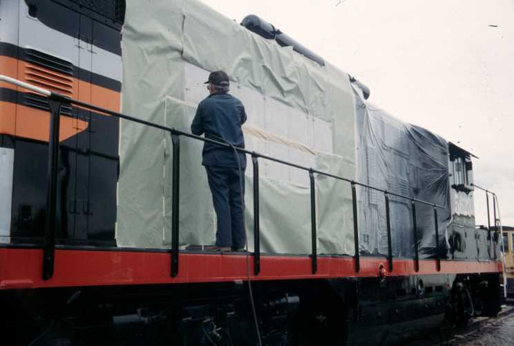 The true story of our Black Widow restoration and paint job goes like this. First and foremost, we never really thought about repainting the 3189 as it looked so good after an intensive cleaning. Having painted locomotives before, I knew how much work could be involved and so, suppressed any urges. One Sunday, Errol and I were alone together at the railroad and decided to try to get the steam generator working. After fooling with the water pump for a while, we found that the water tanks had so much sludge in them that the pump would not work. So, on a whim, we decided that the tanks should be removed and cleaned out. And so it was that the tanks were pulled out from under the locomotive, the tops cut out, the sludge removed, new baffles installed and then put back in place.