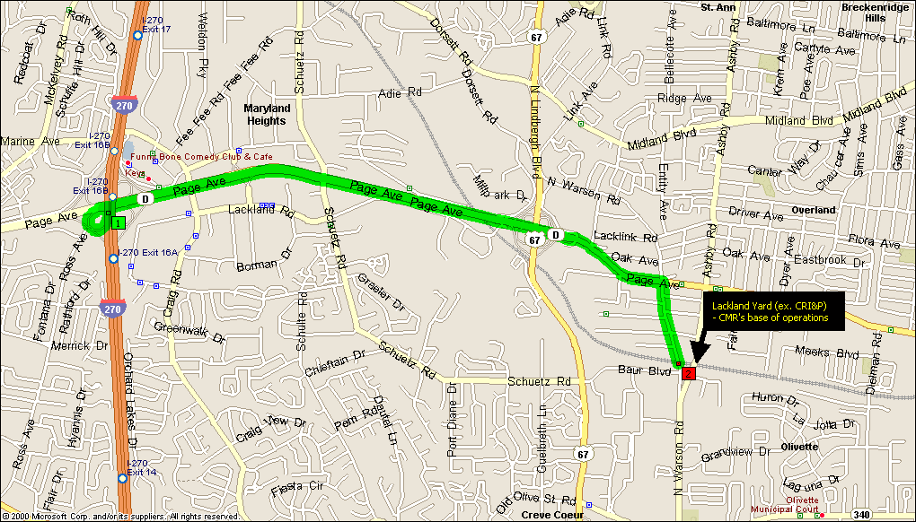 MAPS: ![]() Adie Road Location ![]() Lackland Yard Click on map for larger version. Contact Info: Central Midland Railway 101 W. Ohio Street, Ste. 1600 Indianapolis, IN 46204 Phone:(317)-616-3424 Fax:(317)-262-3314 Contact David Oesch, Manager of Operations, at: Phone: (314)-427-0621 Fax: (314)-427-3965 Email: davido@cmrailway.com Official Central Midland Railway Website |