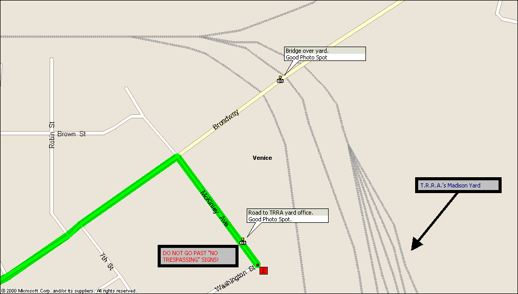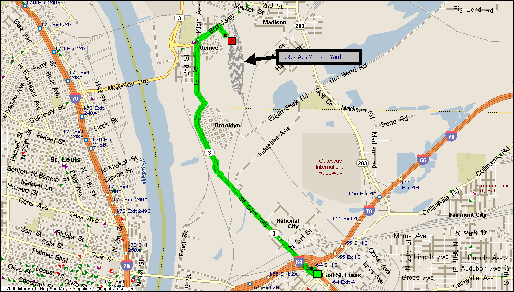 MAPS: ![]() ![]() PhotoSpots. Click on maps for larger versions. NOTE: When at Madison Yard, stay on the side road and overpass, DO NOT GO PAST THE "NO TRESPASSING" SIGNS! DO NOT ATTEMPT TO ENTER THE YARD, OR APPROACH THE YARD OFFICE! Contact Info: Terminal Railroad Association of St. Louis 700 North Second Street St. Louis, MO. 63102 Phone: (314)-539-4704 Fax: (314)-539-4795 Contact Bill Broyles, General Manager at: Phone: (618)-451-8461 Fax: N/A Email: N/A Official T.R.R.A. Website |