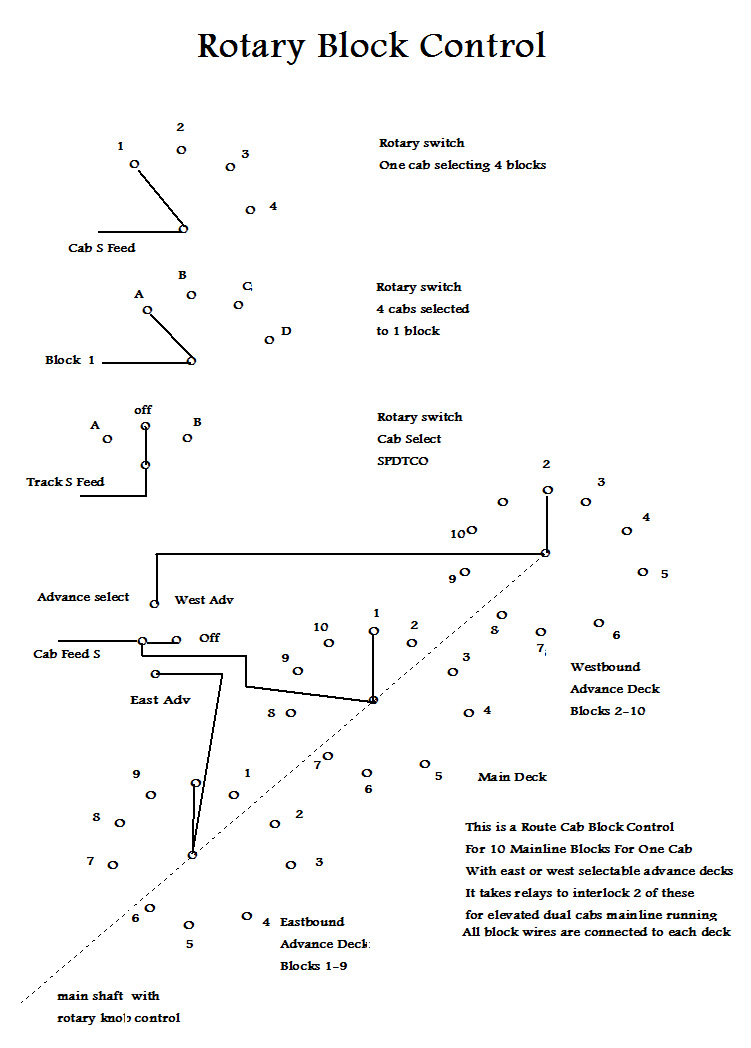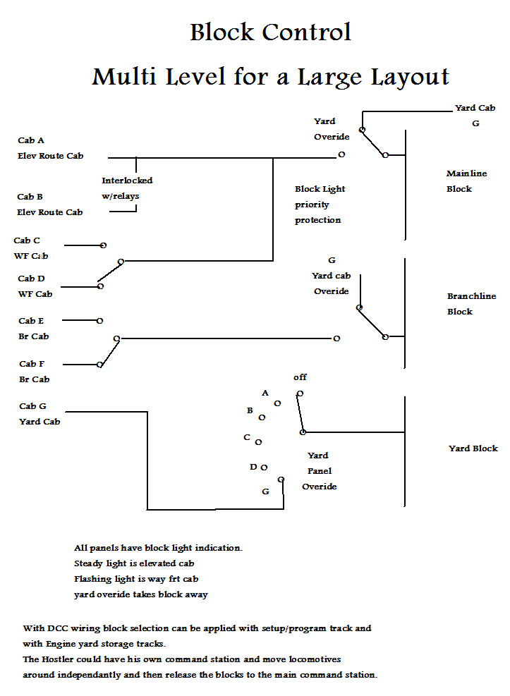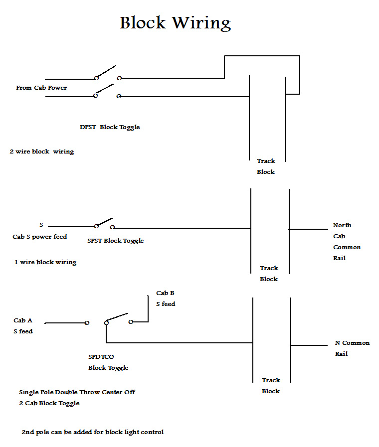 Track block wiring depends on the type of controls you are using. The old original 2 wire scheme with Double Pole toggles requires 2 wires (N & S) to each track block. The common rail (N) wiring system only rquires 1 wire (S) for each block from the panels. if you have duplicate panels for the same blocks then interlock wiring comes into play to protect each panel. 2 cabs in one panel is handled by SPDTCO toggles and automatically does the interlock for the 2 cabs. If your block switches are powering the block lights then they need to be Double pole swithes. If you have a small layout with one doulble cab panel the toggle switches indicate the cab selected by the postion of their handle. In this case no block light circuit is required. In larger layouts you get into rotary block switches and relay interlocks. This covers more than 2 cabs and more than 2 panels with the same blocks involved. With yard cabs you can wire a yard overide switch which works with a 2 cab panel besides the yard panel and gives the yard the control. This only works for yard master control on a larger layout. Of course with DCC all of this block control goes away except for the reversing sections which can be automated. With DCC then you need yard master control of the yard entry signals to protect the yard entrance.