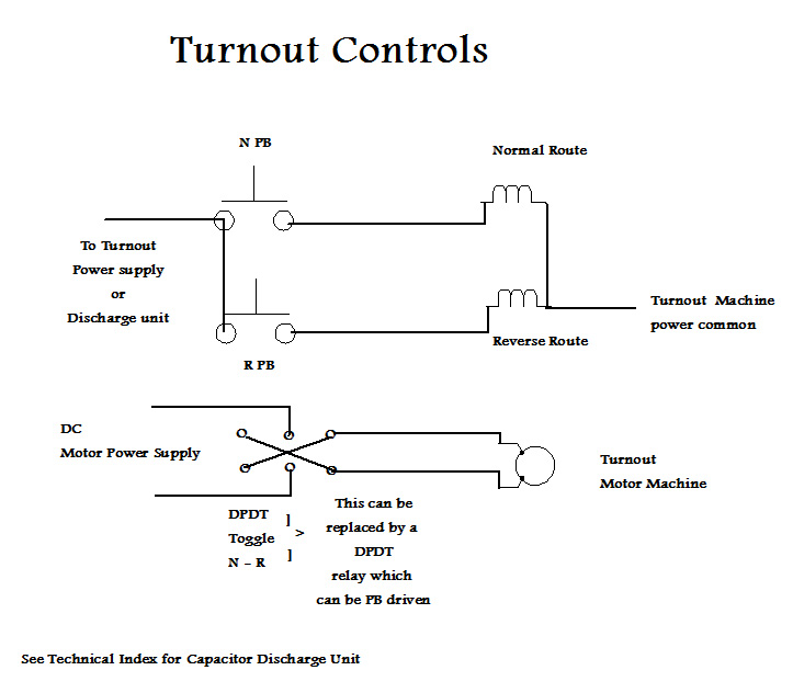 Turnouts are controlled either with manual throws or with electrical coil machines or motor machines. All throw mechanisms require electrical contacts to energize the frogs (and dead sections with DCC) as well as turnout indicator lights, signal systems, and any block selection. Relays added to the mechanism can handle the several circuits if required. It takes 1 pole per circuit to handle the job. Electrical coil (solenoid) type machines can be energized with discharge units which give them all the power they need and then shut off to protect the coils. When the button is released then the discharge unit recharges. The use of this discharge with diode matrix and therefore multi machines becomes more difficult. The multiple machines (2-8 at a time) draw higher current and there by power than when a single machine is selected. The first reaction is to raise the voltage to accomodate the multiple machines. This is damaging to the firing of a single machine and can destroy the machine. The answer is to not raise the voltage but increase the capacitor size to 4000, or up to 6000 mfd.This then releases the energy at the proper voltage and with the power that the machines require without a higher current than normal. Coil machines work with push button controls primarily (can be used with rotary selection switch and 1 button). The motor machines require a toggle switch which can reverse the polarity to make them reverse the throw on the turnout. A DPDT relay can do this with push button drive to energize the relay. This then allows the motor machines to run with push button control and diode matrix logic. Motor machines with relay control can be mixed with coil machines in the same diode matrix running the relays off the same discharge unit. The DCC control logic can run motor machines if the control units have DPDT functions.