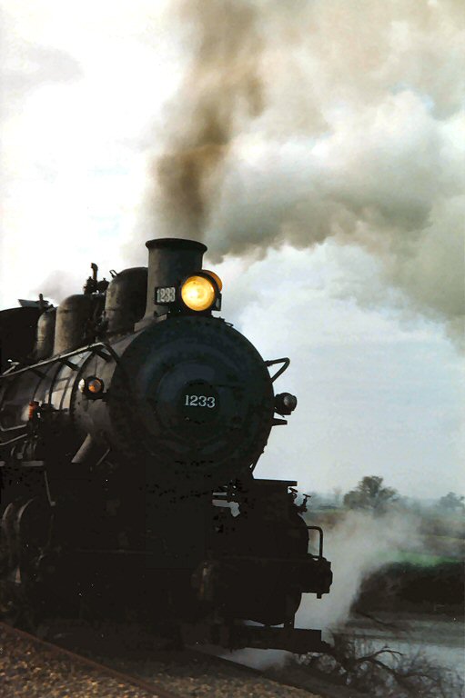 cloudy California day. Mike Florentine caught the 1233 with light smoke and lots of steam as the engineer plays the whistle approaching Tasco. |