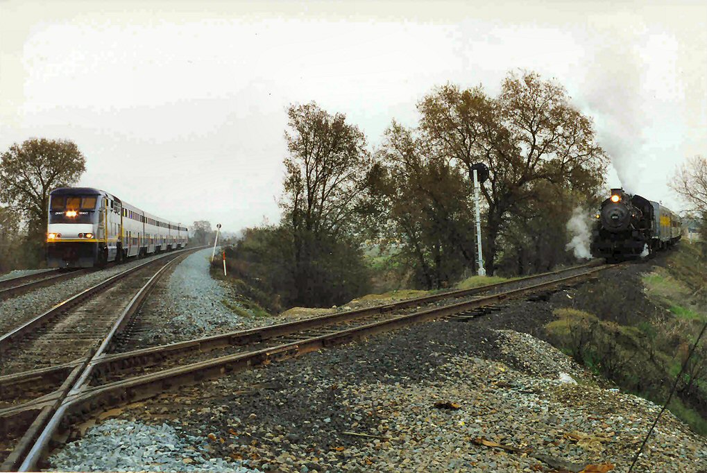 Amtrak Capitol to clear the diamonds. The Capitol is westbound, its next stop will be Davis, CA. Mikon is located at m.p. 86.9; about two miles west of the