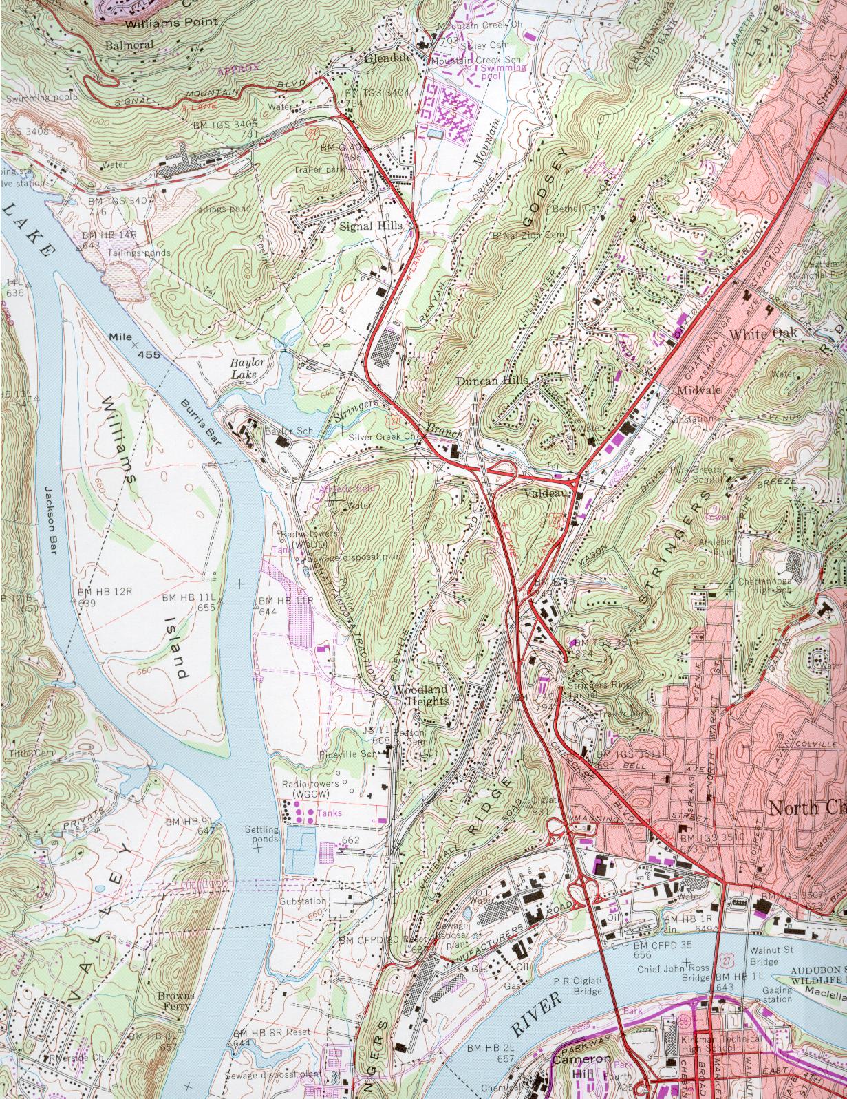 View a map of the Traction Company route in Red Bank, North Chattanooga, and at the foot of Signal Mountain. This file is about 620 K in size so it may take a while to download if you're on a slow internet connection. This is a USGS topographic map and is in the public domain.