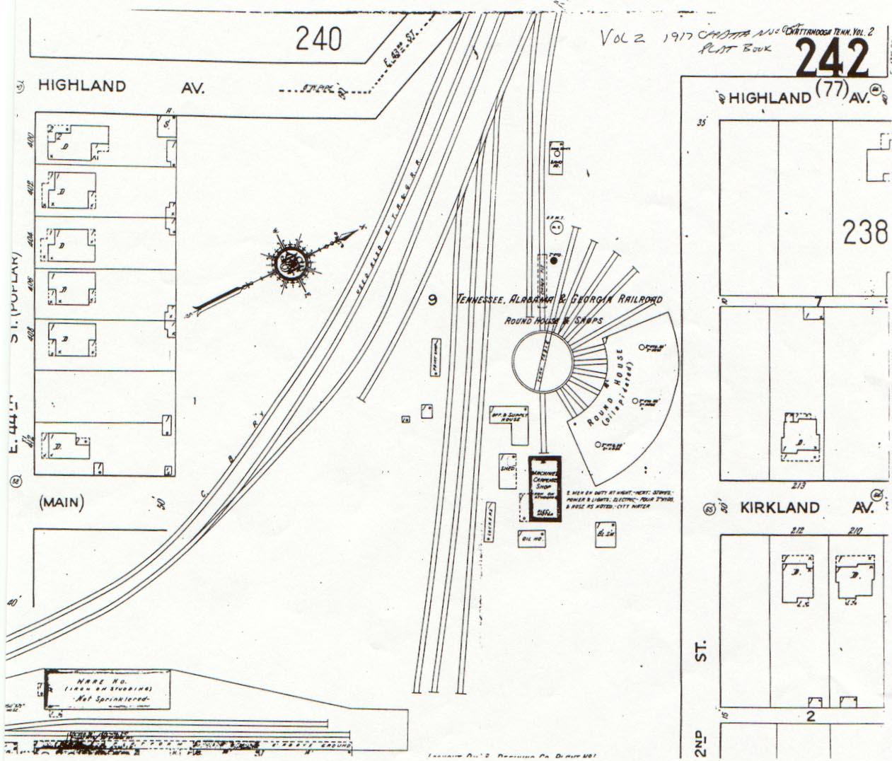 Map of the Chattanooga TAG Railroad yard in 1917 (it was the TAG Railroad at that time). Notice that the roundhouse is marked dilapidated as the TAG was having hard times financially at that time. Drawing courtesy of Warren Stephens. |