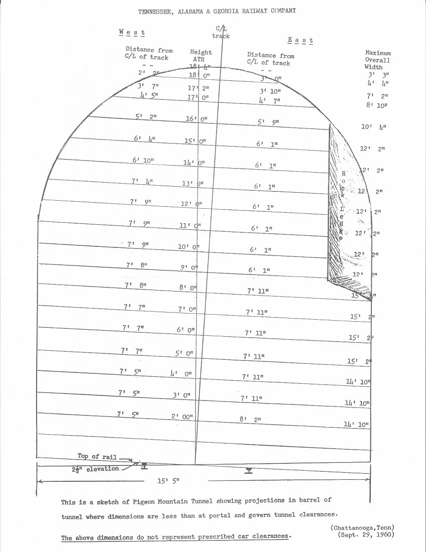 Pigeon Mountain tunnel sketch. This sketch details areas within the tunnel bore where the dimensions are less than at the tunnel portals. Dated September 29th, 1960. |