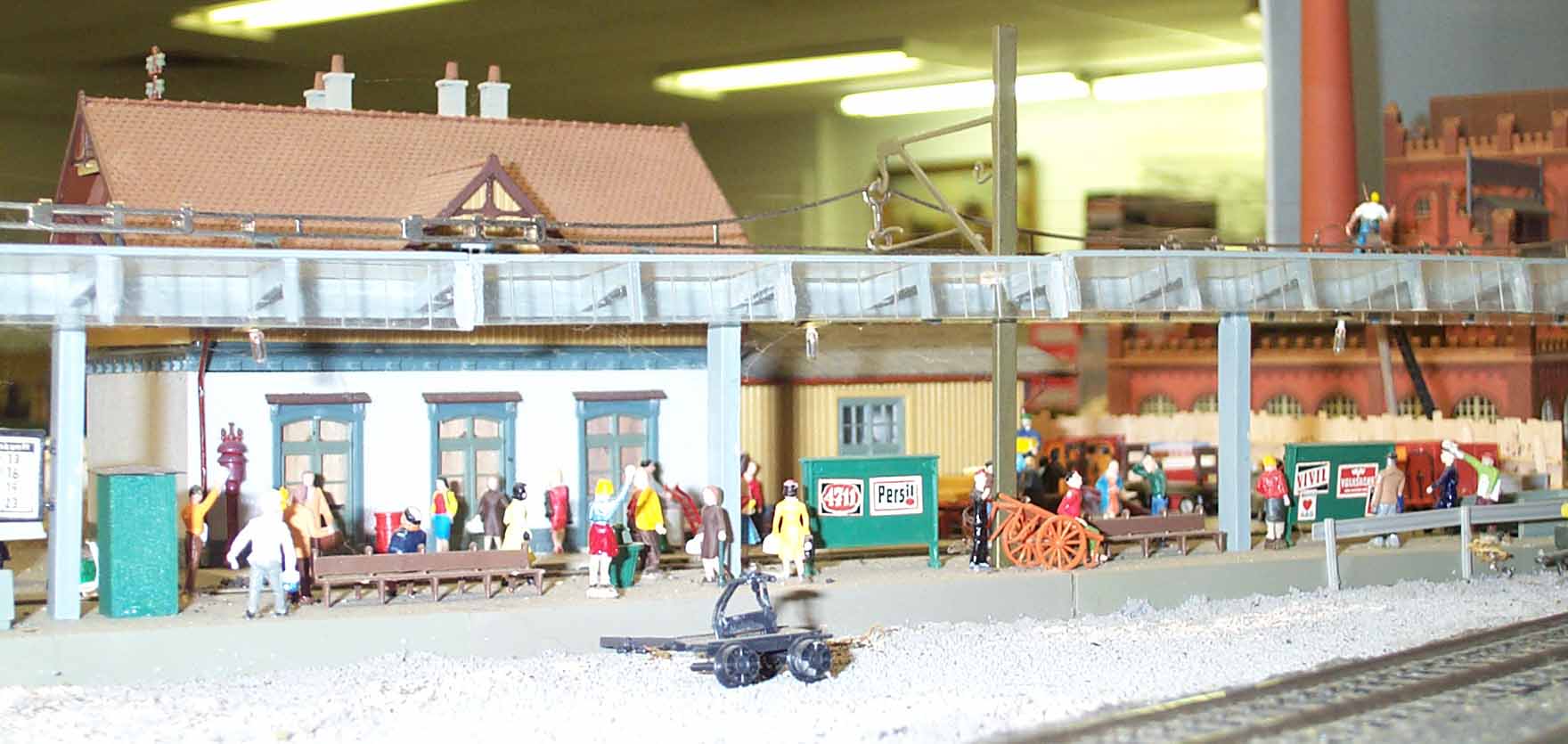 The module is a 4 ft by 2 ft module. The main scene is a European style passenger station off a branch line. There is also a nice city scene.
