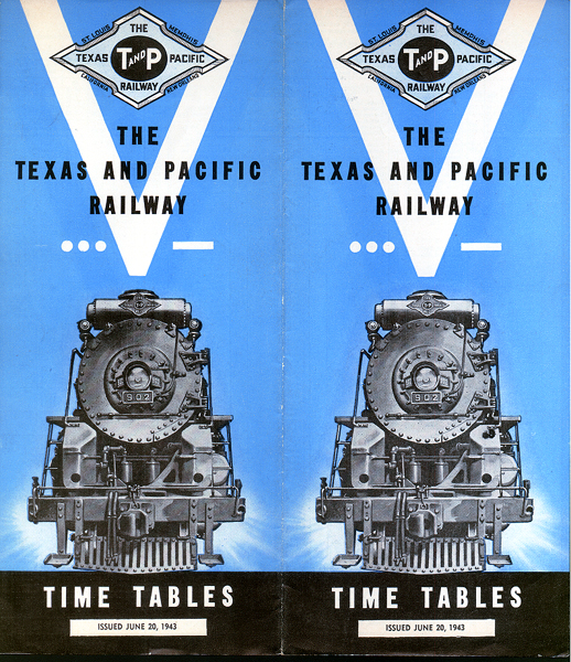 I have several T&P timetables - I think this 1943 edition is my favorite. Of course, I love the big 900-class Mountain steam locomotive, used to pull passenger trains. But also notice the wartime patriotism - the "V for Vicotry" and the three dots and a dash - Morse code for "V." |