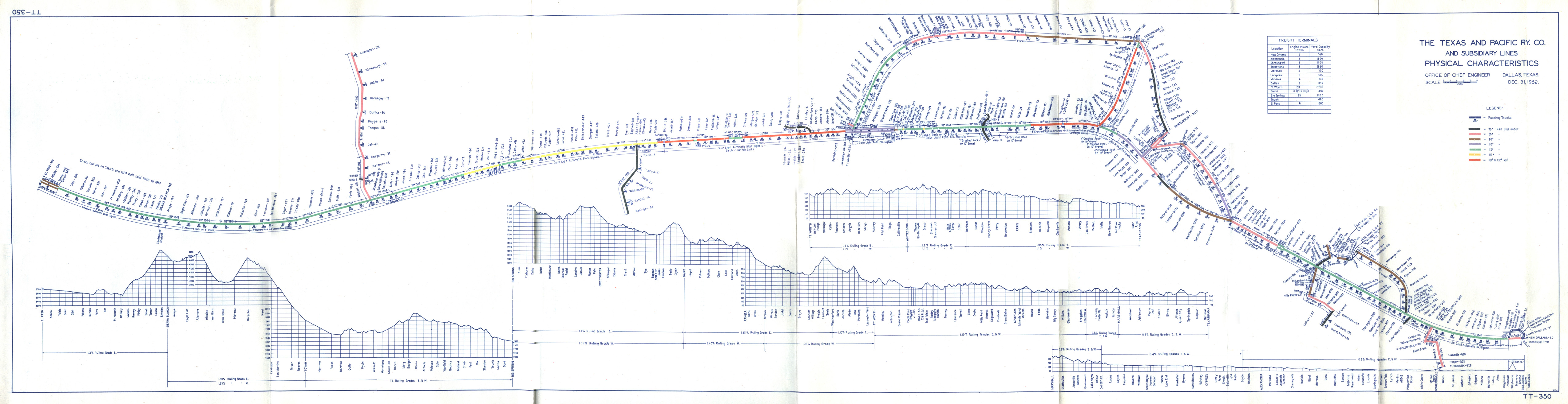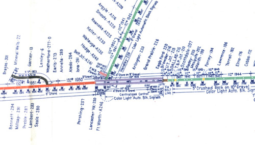 T&P System Elevation Chart This elevation chart was given to me by Mr. Don Millender, former government liason officer for the T&P/MoPac, and later a consultant for the UP - he also gave me the 1960 calendar, shown above. It contains a wealth of track information along the entire T&P system. Above is a thumbnail of the entire map; below, a closeup of the DFW area. Click here to download an 11x17 copy of the map.
