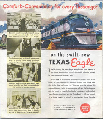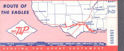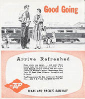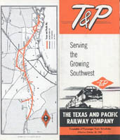 ![]() The T&P published this booklet, "Mainline Minia-Tours" in the 1950s as a travel guide for passengers. It includes information about the major towns and points of interest along the route, as well as descriptions of the various types of cars and services offered on the train. I consider it a very nice piece of T&P memorabilia. |