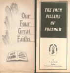 Through much of the 1950s, the T&P conducted a very successful advertising and public relations campaign, placing ads in major national magazines. These ads promoted pro- Christian and pro-American values and the Free Enterprise system, and received various advertising awards. (See my page "Advertising the T&P" page for some examples.) Readers of the ads were invited to write to T&P for brochures by railroad president W.G. Vollmer; one was "Our Four Great Faiths," another was "The Four Pillars of Freedom." The booklet "Toward a Better World" contained small-sized reprints of the ads. Thanks to Mrs. Jo Ann Bailey for sharing this material with me. |