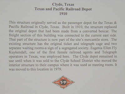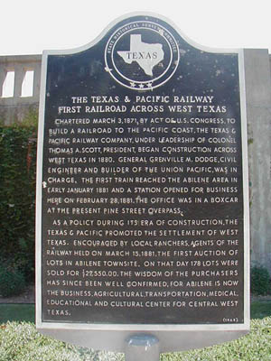 Buffalo Gap The irony, of course, is that the T&P was SUPPOSED to go through Buffalo Gap in 1881, but Abilene's backers "stole" it away. Now at last, Buffalo Gap has a T&P station! |