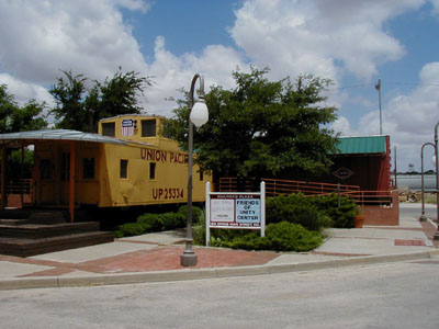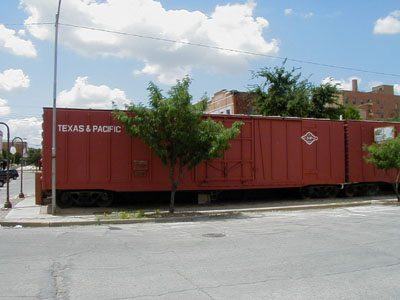 Just south of the yard is "Railroad Plaza", with a UP caboose (left) and this repainted T&P boxcar (below). |