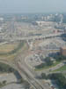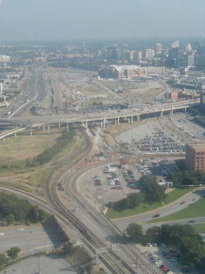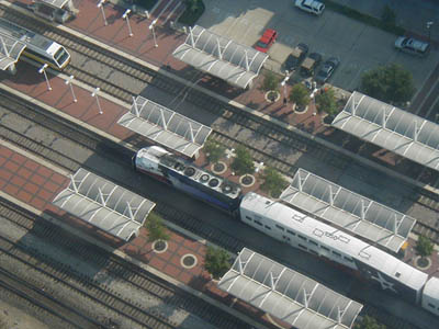 Looking down from Reunion Tower to the tracks at Dallas Union Station - DART Light Rail is approaching on its tracks, TRE is waiting on its own. Amtrak's "Texas Eagle" uses the bottom set of tracks, belonging to UP. |