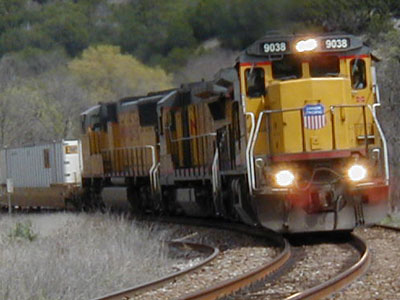 This UP stack train, led by unit 9038, came by while I was there, with roaring engines and zinging flanges, heading up steep Ranger Hill. |