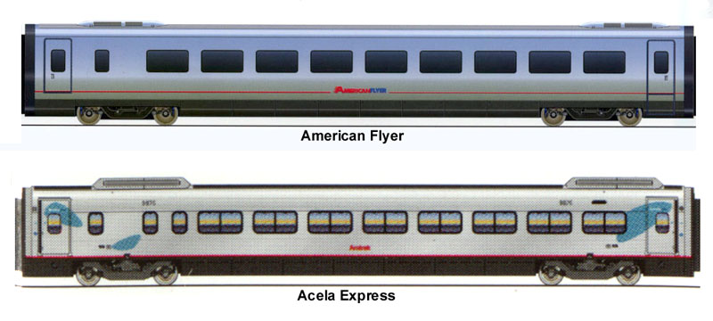 Two profiles of an Acela Express Business Class car. Top, as shown in a 1997 American Flyer marketing brochure from Bombardier. Bottom, as shown in the Acela Express seatback safety brochure.