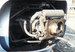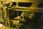 The air compressor on Duplex unit 29004, trainset 202. The compressor, one of two per trainset, is located at the rear of the unit and supplies air for the brakes. Behind the compressor you can see one of the fusible horizontal structural members, which deform and absorb energy in the event of a collision. The yellow tint is due to the incandescent lighting of the engine room. Photo by Clem Tillier (ctillier@alumni.princeton.edu) |