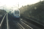 Duplex trainset testing on the LGV Sud-Est, as seen from the cab of another TGV. November 1996. Photo by Yann Nottara (ynottara@mail.dotcom.fr) |