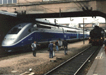 Past meets Future: Duplex trainset 202 and steam locomotive 141TB 424 meet up in the Mulhouse train station, celebrating the 25th anniversary of the Musée du Chemin de Fer (rail museum) on 21 September 1996. Photo by Yann Nottara (ynottara@mail.dotcom.fr) |