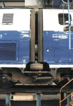 The Scharfenberg coupler on a TGV Duplex power car. This automatic coupler is used when two trainsets are hooked together to make a higher capacity train (in this case, up to 1090 seats). The horizontal gray door above the mating plate protects the electrical and pneumatic connections. The "thumb" protruding forward serves to properly align the couplers as they approach each other. It actually sticks out of the nose fairing and is sometimes taken for a Pitot tube! To see this coupler in action, see the pictures on TGV maintenance. Photo by Yann Nottara (ynottara@mail.dotcom.fr) |