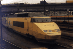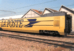 TGV La Poste at the Conflans shops near Paris Gare de Lyon. These yellow TGV trainsets are owned by the French postal service and serve to carry mail. October 1997 photo. Photo by Benoît Géhant (bgehant@ese-metz.fr) |