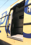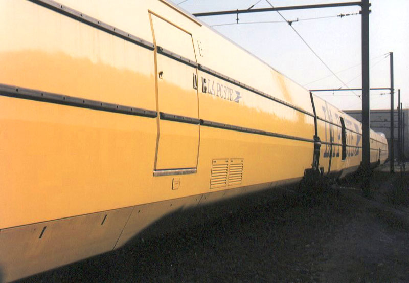 TGV La Poste at Villeneuve St-Georges shops. The large plug doors replace the conventional doors. Rubber stripping protects the sides against impacts from mail carts during loading and unloading. Photo by Yann Nottara (ynottara@mail.dotcom.fr) |