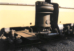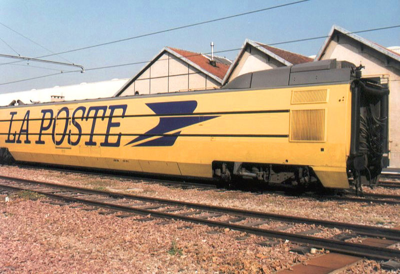 TGV La Poste at Villeneuve St-Georges shops. The bogies on the postal trainsets have a unique design of pneumatic secondary suspension that is a precursor to the SR-10 pneumatic suspension that was retro-fitted to the entire PSE fleet in the early 1980s. Photo by Yann Nottara (ynottara@mail.dotcom.fr) |