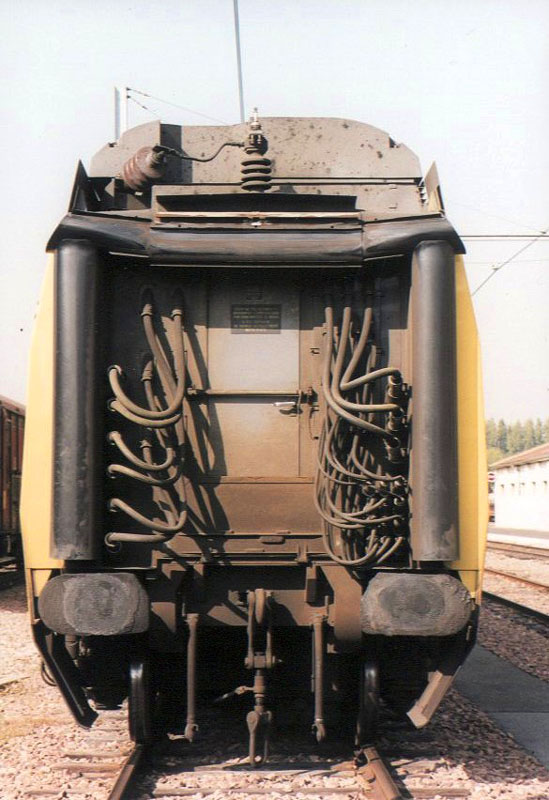 TGV La Poste at Villeneuve St-Georges shops. End view of the first trailer, showing standard buffer and screw link coupler. The fat cables are for routing traction power to the traction motors on the first bogie (only PSE trainsets and Eurostar have this feature). At the top is the 25kV power cable which runs along the top of the trainset, linking the power cars at each end. Photo by Yann Nottara (ynottara@mail.dotcom.fr) |