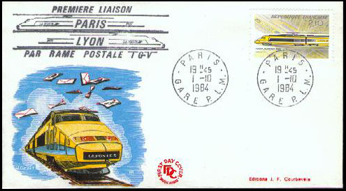 The French postal service issued this commemorative stamp on the first day of TGV postal service, 1 October 1984. |