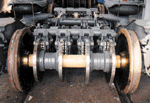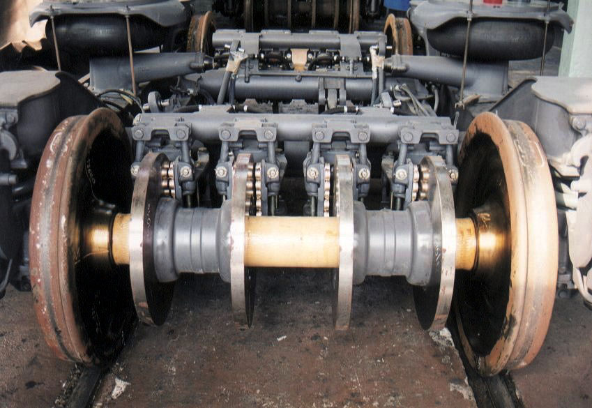 A TGV Duplex Y237b bogie. Each axle is equipped with four unvented brake disks. On the end of the journal box in the foreground is a wheel tachometer, which is used by the antilock braking system to prevent the wheel from sliding when braking.  The antilock braking control system uses a speed reference input from the train's main computer, and compares this speed to the measured speed of the axle.  The acceleration and its derivative are used as inputs as well for the local microprocessor which controls braking force. Villeneuve St-Georges maintenance shops, October 1997.