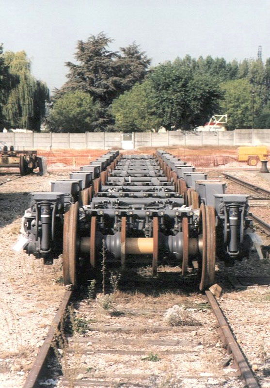 A row of Y237b TGV Duplex bogies sitting on a storage track.  Villeneuve St-Georges maintenance shops, October 1997.