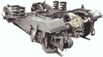 The Y230 bogie used on PSE, Atlantique and Réseau trainsets. The drawing shows the traction motors, which are actually attached to the carbody and not to the bogie frame. The tripod transmission shaft is highlighted in red.