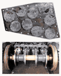 Part of a brake pad from the high power disk brakes found on the majority of TGVs. The round elements are the brake pads themselves, made of sintered steel. (initially PSE trainsets were outfitted with composite pads, since replaced by the system shown here). As you can observe from the photo of a TGV Duplex bogie at the bottom, there are 16 elements like the one shown here on each axle, for a total of 144 elements per axle.
