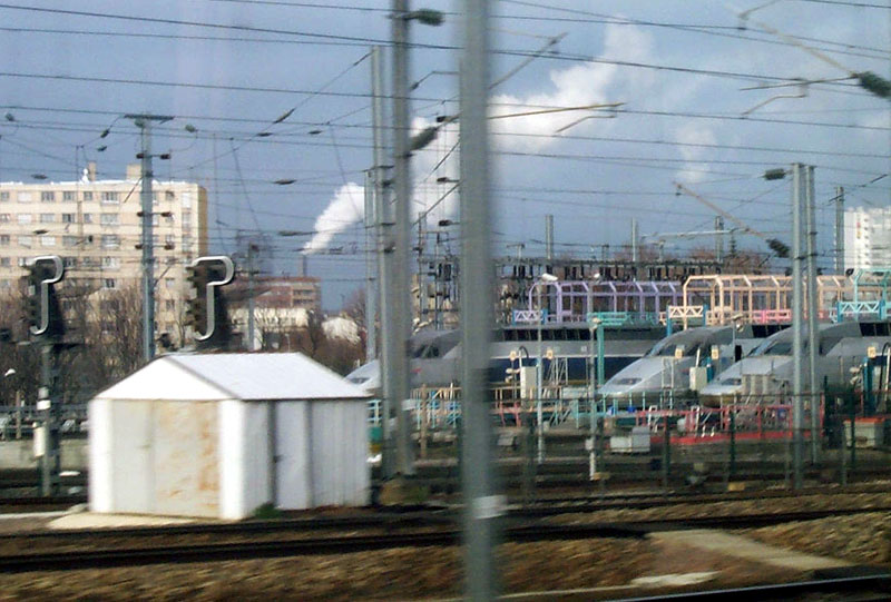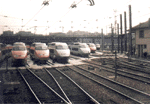 A small portion of the Landy TGV maintenance shops just north of Paris, snapped from inside a passing RER train. Colored structures around three TGV Réseau trainsets are inspection gantries. January 2000.