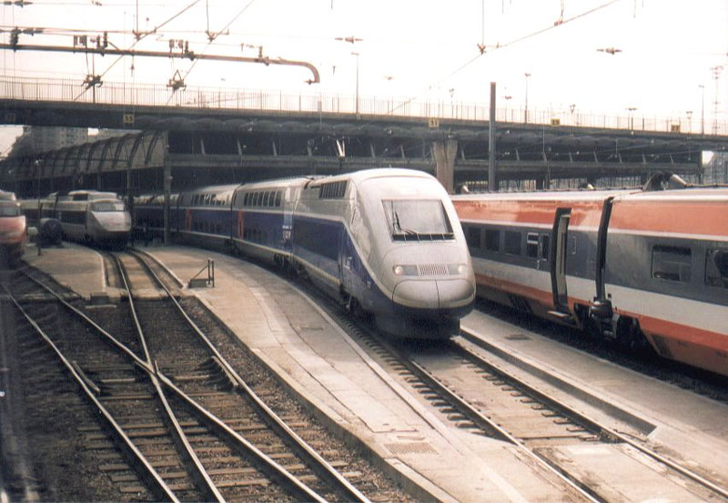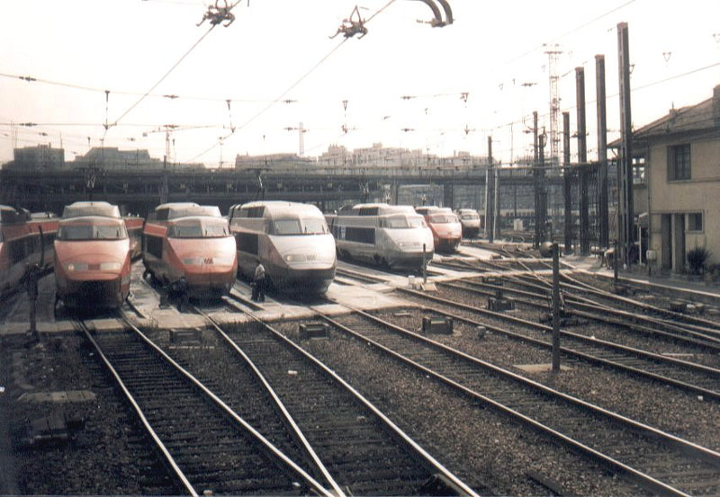 Outside the Villeneuve St-Georges maintenance shops on the southeast side of Paris. A brand new TGV Duplex between two TGV PSE trainsets. October 1997.