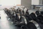 TGV PSE wheelsets awaiting reprofiling at the Villeneuve St-Georges maintenance shops. These wheelsets, unlike the above Duplex wheelsets, use vented brake disks. All trainsets since the first generation PSE trainsets have used higher performance unvented disk brakes which have the side benefit of lowering aerodynamic drag.