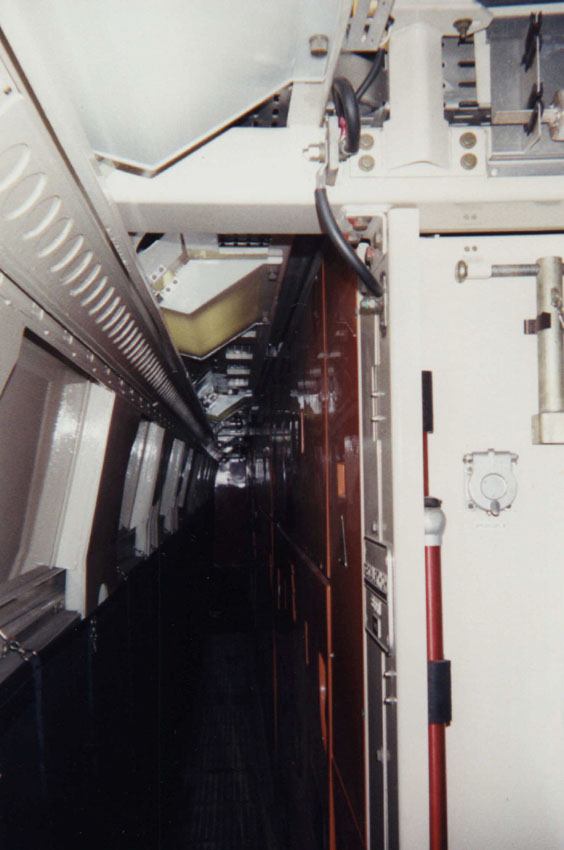 The gangway inside a TGV power car. There are two gangways, one to either side of the traction equipment which sits in the cabinets in the middle.