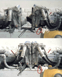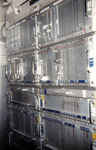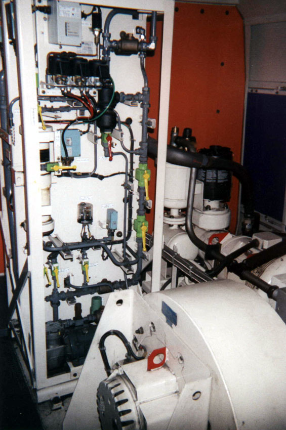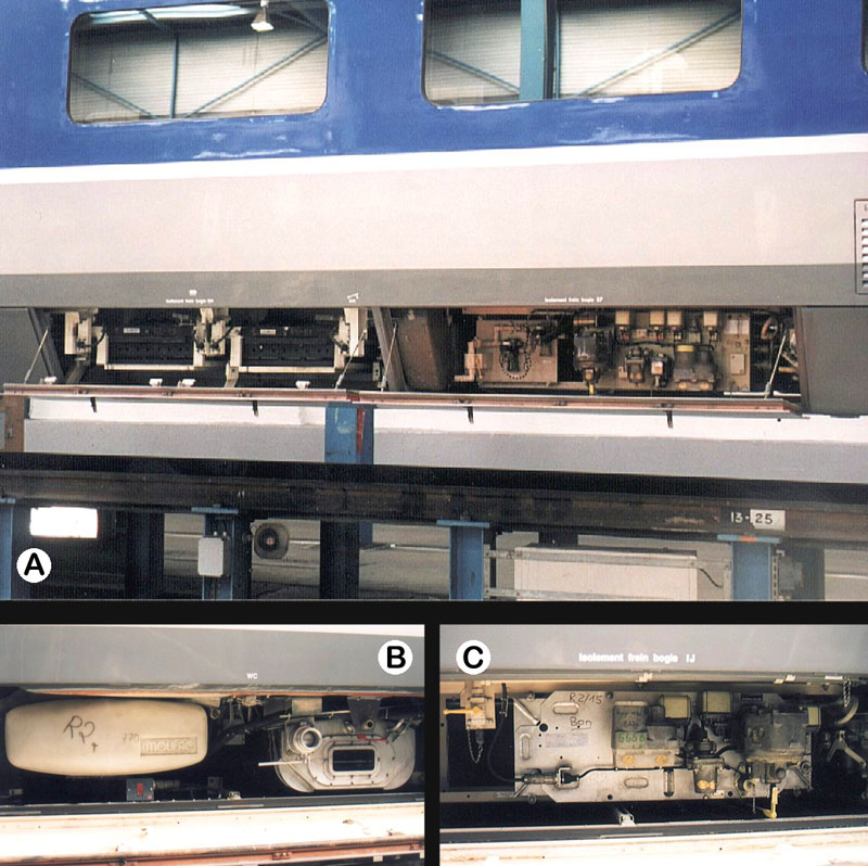 Some of the underfloor auxiliary equipment in TGV trailers. (A) shows the arrangement of the equipment bays. (B) shows the part of the vacuum toilet that you would never see as a passenger, and (C) shows brake control hardware such as electrovalves, etc. October 1997.