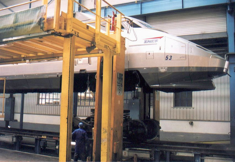 Inside the Villeneuve St-Georges maintenance shops, renovated PSE trainset 53 is lifted. The lifting apparatus simultaneously lifts the entire trainset, using the TGV trainset's standardized lift points. This allows the removal of wheelsets for maintenance work.