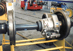 Part of the TGV's famous "tripod" transmission. What you see here is just the gear reduction stage on an axle from a powered bogie. The transverse drive shaft (whose other end would connect to the traction motor) would fit into the round opening at the rear of the gearbox. October 1997.