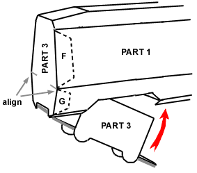 Figure 5 fit of rear bogie into power car body.Step 31 Glue part 3 onto the bottom of the car as shown by the red arrow in figure 5 above. Make sure everything is aligned straight and square.