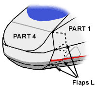 Step 22 On to the nose. The front part of the nose should bend down as shown in figure 3 below. Apply glue to flaps L, one or two at a time, and press them into place by using a tool (a dull table knife is good) inserted from below and inside the model to apply pressure while the glue sets. Finish by gluing the dark-gray bottom section to the sides of the nose as shown below.